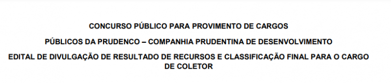 PRUDENCO ? COMPANHIA PRUDENTINA DE DESENVOLVIMENTO, no uso de suas atribuições legais, na forma da lei, de acordo com o Edital N.º 01/2022, publicado no JORNAL O IMPARCIAL, de 05/01/2022, seção de Publicações oficiais, páginas 28 a 29, DIVULGA o resultado dos recursos contra a divulgação do resultado das provas de aptidão física e da classificação prévia e divulga, ainda, a Classificação Final para o cargo de Coletor.