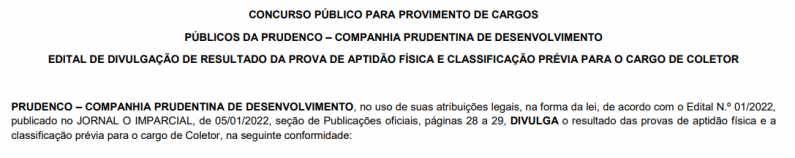 PRUDENCO COMPANHIA PRUDENTINA DE DESENVOLVIMENTO, no uso de suas atribuições legais, na forma da lei, de acordo com o Edital N.º 01/2022, publicado no JORNAL O IMPARCIAL, de 05/01/2022, seção de Publicações oficiais, páginas 28 a 29, DIVULGA o resultado das provas de aptidão física e a classificação prévia para o cargo de Coletor