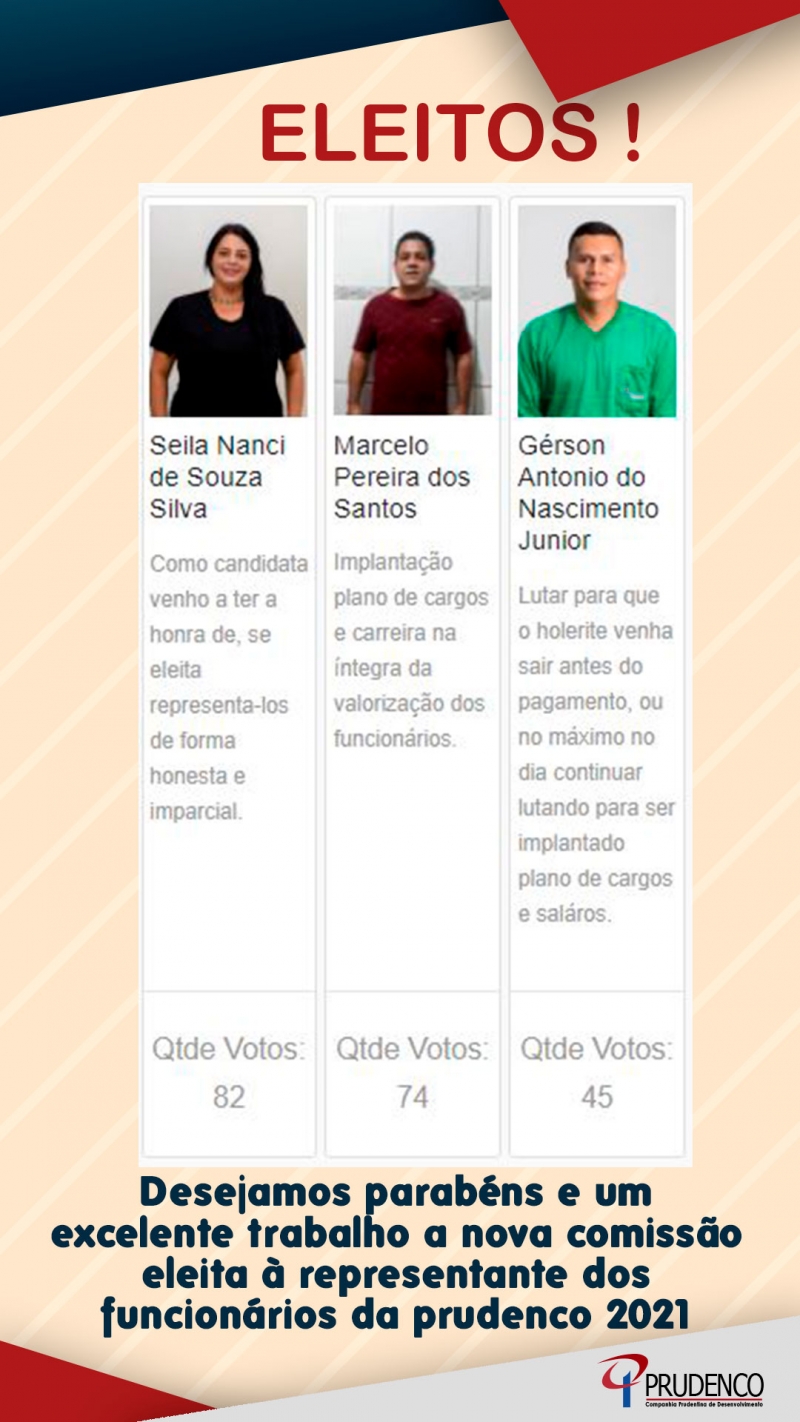 Desta forma foram eleitos como representantes dos funcionários, Seila Nanci de Souza Silva, Marcelo Pereira dos Santos e Gérson Antônio do Nascimento Junior, ficando suplentes: Flávio Roberto da Cunha, Paulo Sérgio dos Santos e Wallyson Leoni Rodrigues, nesta ordem de classificação. A comissão eleitoral estipulou que o período de gestão será de 20 de maio de 2021 à 20 de maio de 2022, a cerimônia de posse será no dia 20/05/2021 às 14:00 horas no centro cultural matarazzo e será transmitida via live no facebook da Prudenco.