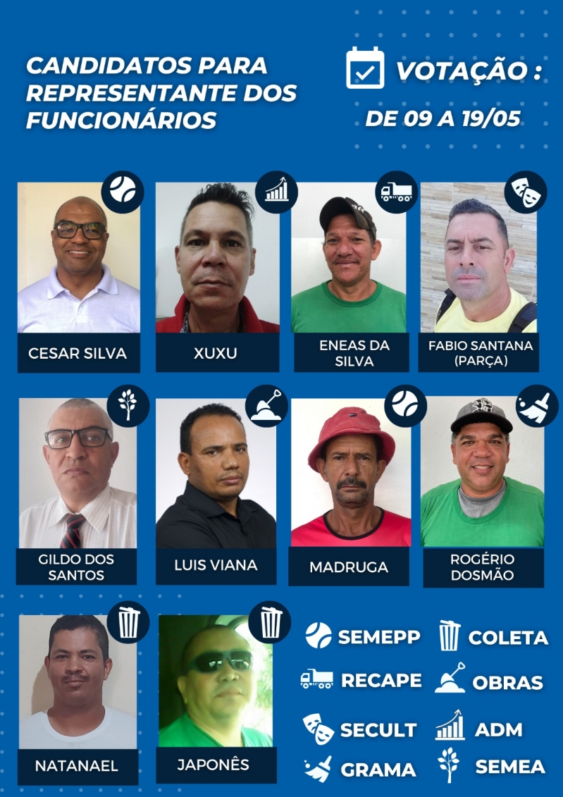 O processo seletivo irá ocorrer entre os dias 09 e 19/05 e a posse dos funcionários mais votados no dia 26 de maio. Neste ano, há candidatos inscritos desde a área de limpeza e capinação até os serviços dentro das secretarias municipais, como de esportes e cultura. Confira os nomes dos servidores e os respectivos cargos de cada um: